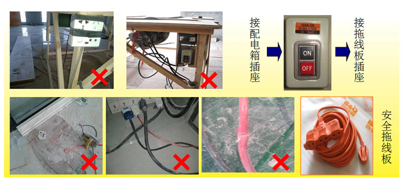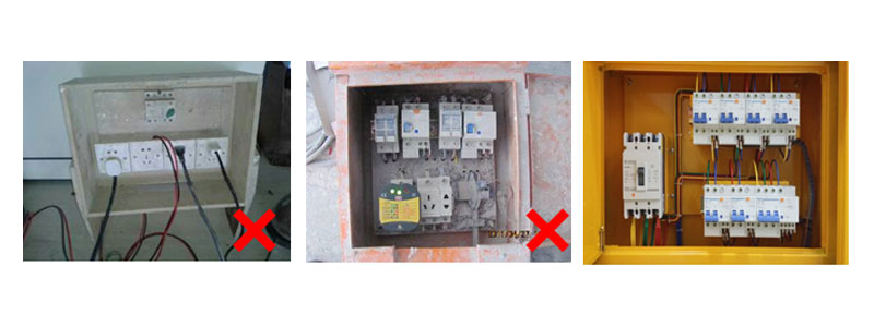 臨時用電必須公司標(biāo)配的配電箱(接入進戶配電箱下樁頭),三相接線正確。引線必須固定,并確保內(nèi)部配件(漏電保護器等)完好,保持箱體內(nèi)外清潔