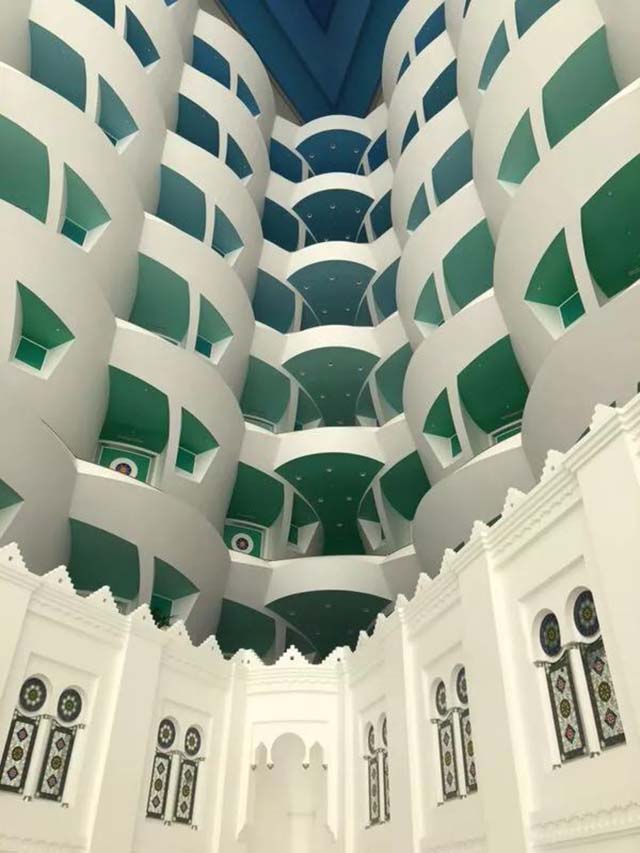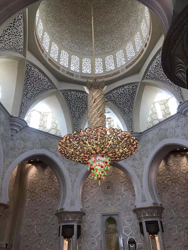 謝赫扎耶德清真寺是為已故老國王扎伊德所建,是阿聯(lián)酋的標(biāo)志性建筑﹐整個建筑群都用來自南斯拉夫的白玉大理石,莊嚴(yán)肅穆,充分體現(xiàn)了伊斯蘭的風(fēng)格。